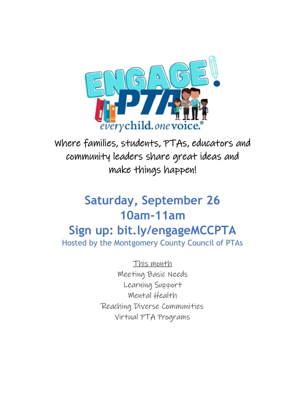 MCCPTA is hosting our 2nd “ENGAGE!” community conversation on Saturday, Sept. 26, 10am-11am. Our first event last month was the result of dozens of you who wanted to talk about how to engage families virtually. Great ideas, projects and best practices were shared. From that we’re hosting monthly “ENGAGE!” conversations for PTA leaders, members, parents, families, students, educators and community leaders who want to be part of SOLUTIONS to support students and families through virtual learning and a world impacted by COVID.